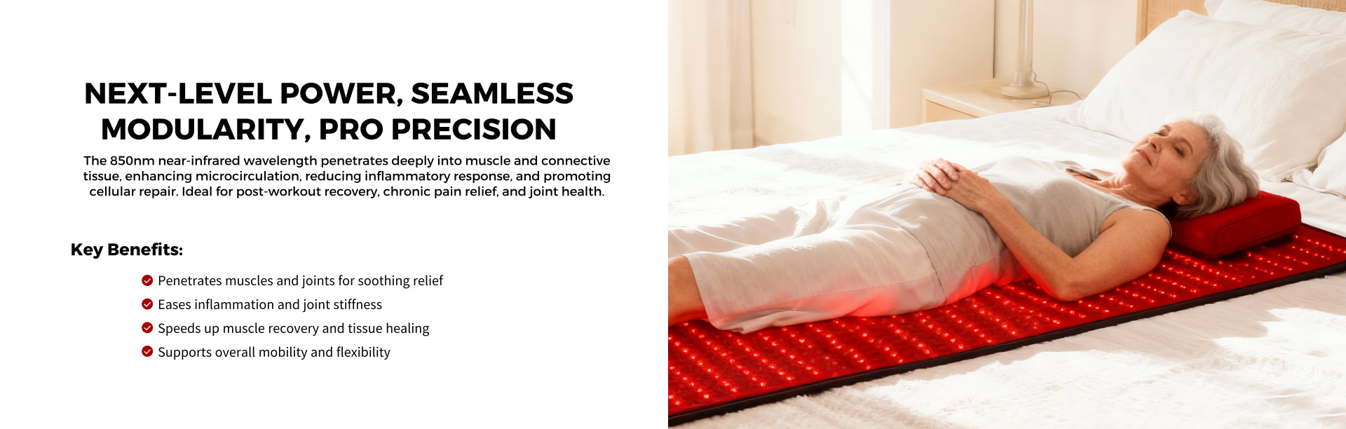 The QuasarMD Mat is a full-body light therapy mat designed for recovery, wellness and comfort. It uses dual-wavelength LEDs (660 nm red light + 850 nm near-infrared light) to penetrate tissue, support circulation, reduce inflammation, and promote repair.